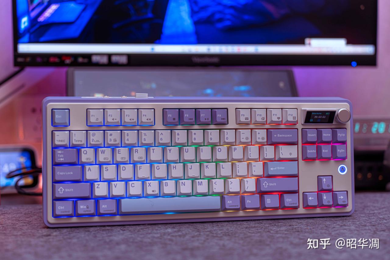 ▼键盘采用前几年比较流行的 87 配列,从个人喜好来说不太能接受这种格局。好在键盘融入了紧凑设计,比常规 87 键盘尺寸更小。键盘右上加入了流行的音量调节旋钮和液晶屏显示,整体来说还是很有特色的。