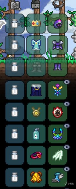 擼樹,挖石頭,探索地表。按esc鍵即可打開揹包,在左下角爲製作欄,右下角從左往右依此爲染色欄,裝扮配飾欄(裝備不起作用),裝備配飾欄(起作用)。只需關注最後一列即可,前三行爲裝備欄,後5行爲飾品,大師難度可多裝備一個飾品。h鍵位快速喝藥