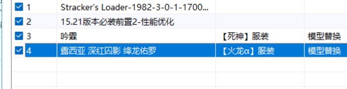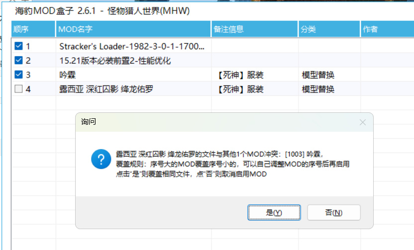 如圖所示,兩個mod替換的都是一套叫死神的衣服,所以衝突,不能同時啓用。