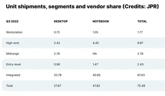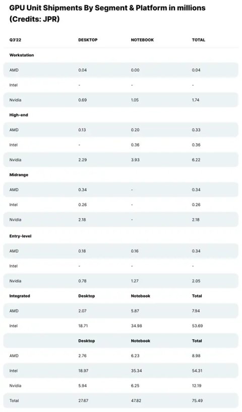 Jon Peddie Research日前公布了2022年第三季度GPU显卡市场报告,总出货量仅7550万,环比减少10.3%,同比锐减25.1%,创下2009年以来最大跌幅。