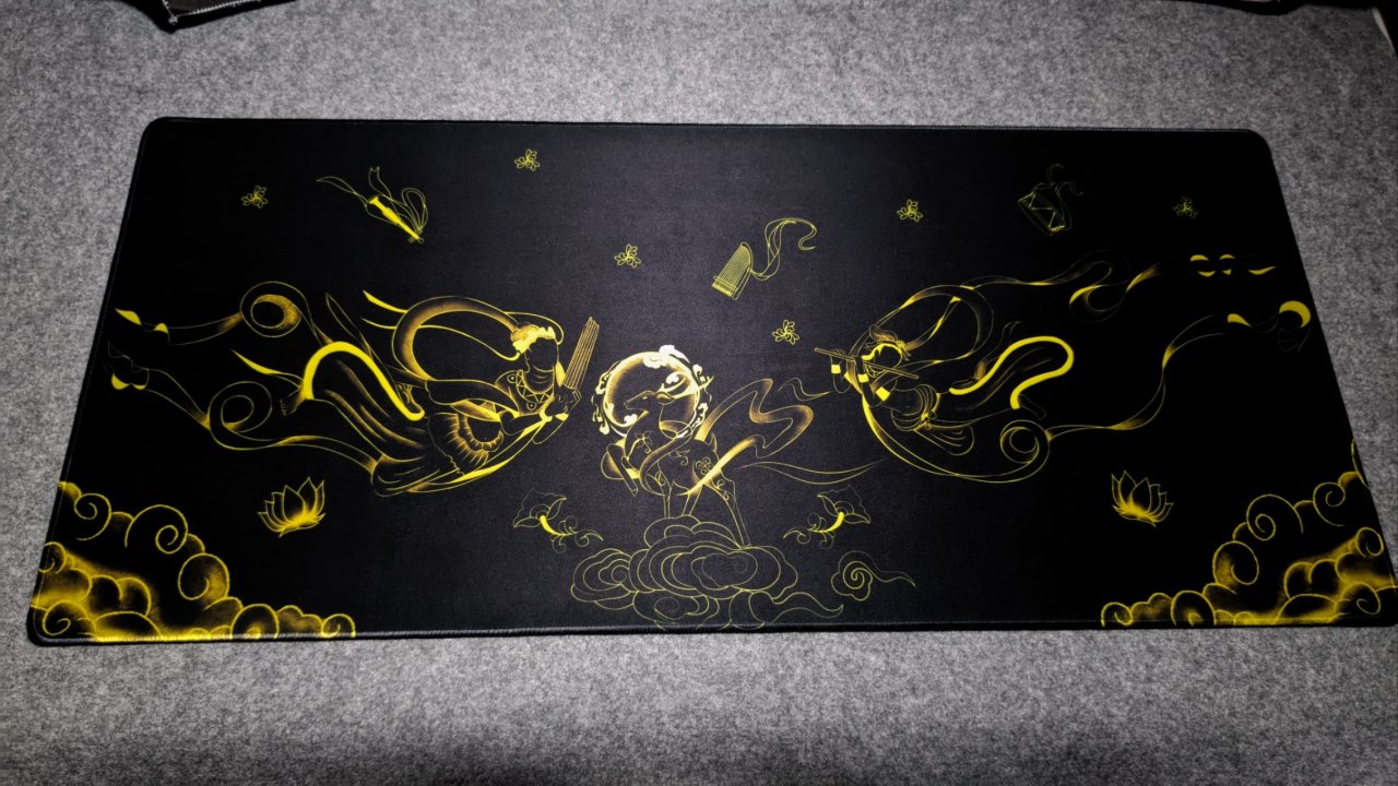 除了键帽,还有一张同主题的鼠标垫,虽然是卷曲发货,但实际上打开后没有发生任何的弯曲现象,并且这张鼠标垫十分长,是一张非常滑的速滑垫,如果你缺一张鼠标垫,可以考虑购入,使用起来颜值与手感表现都很不错