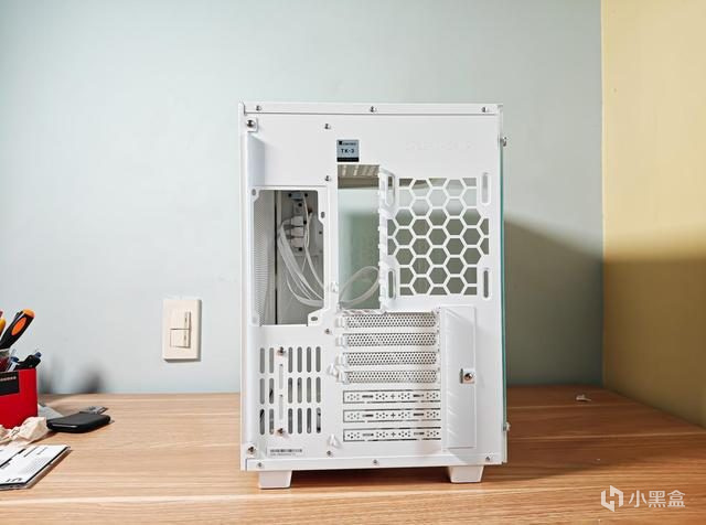 从正面观看,清透的玻璃让里面一览无余,可以看见背板上全是孔洞。右侧的是侧面的风扇/水冷位置,而左侧则是主板位置,支持背插。底部和上部都有通风设计,后置也有传统的风扇位置支持。