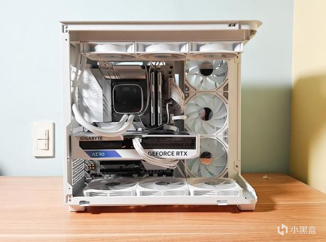 然后在侧面,同样安装了3只风扇。这款乔思伯TK3最多可支持10支120mm风扇,所以不要再说是海景房机箱是闷罐子了,这么多风扇,哗啦啦啦的大风吹。