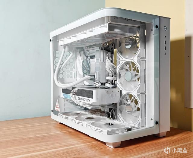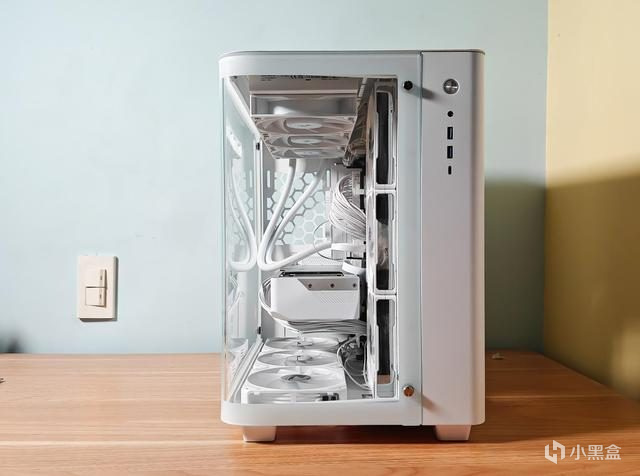 将一体折弯曲面玻璃装上固定好,我们看这款电脑安装完毕了。效果很好看,里面的配件一览无余。玻璃通透性很好,宛若无物一般。