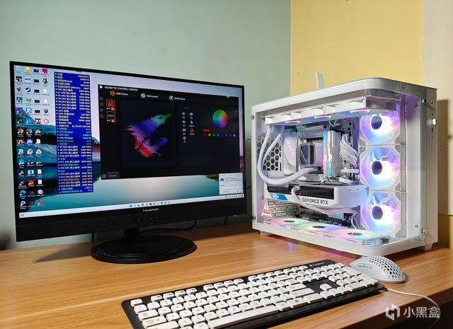 接好电源启动电脑看看,电脑里面泛出了七彩的光芒,9个ARGB风扇的彩光,机箱主板、内存、水冷的彩光,真是好看啊。
