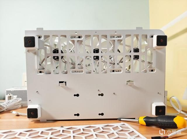 拿掉防尘网,在底部固定好了3支反向风扇。