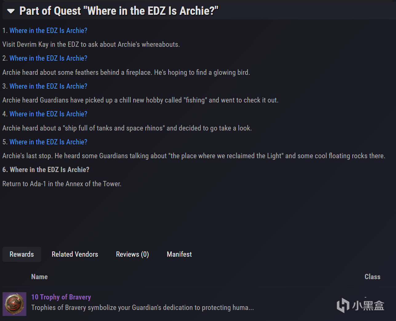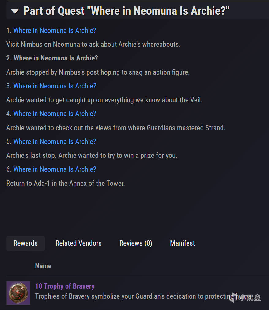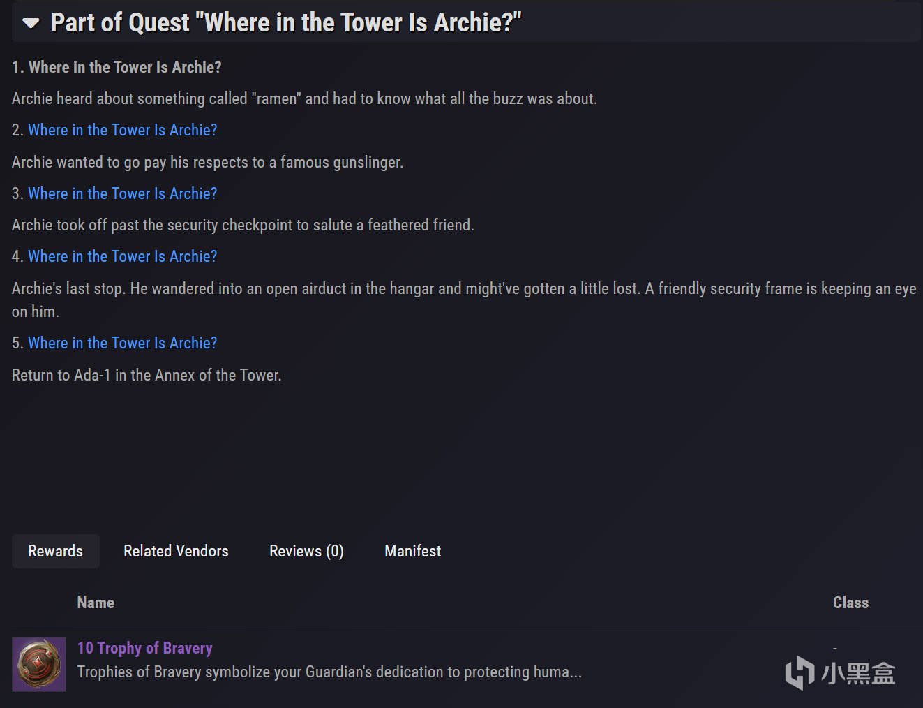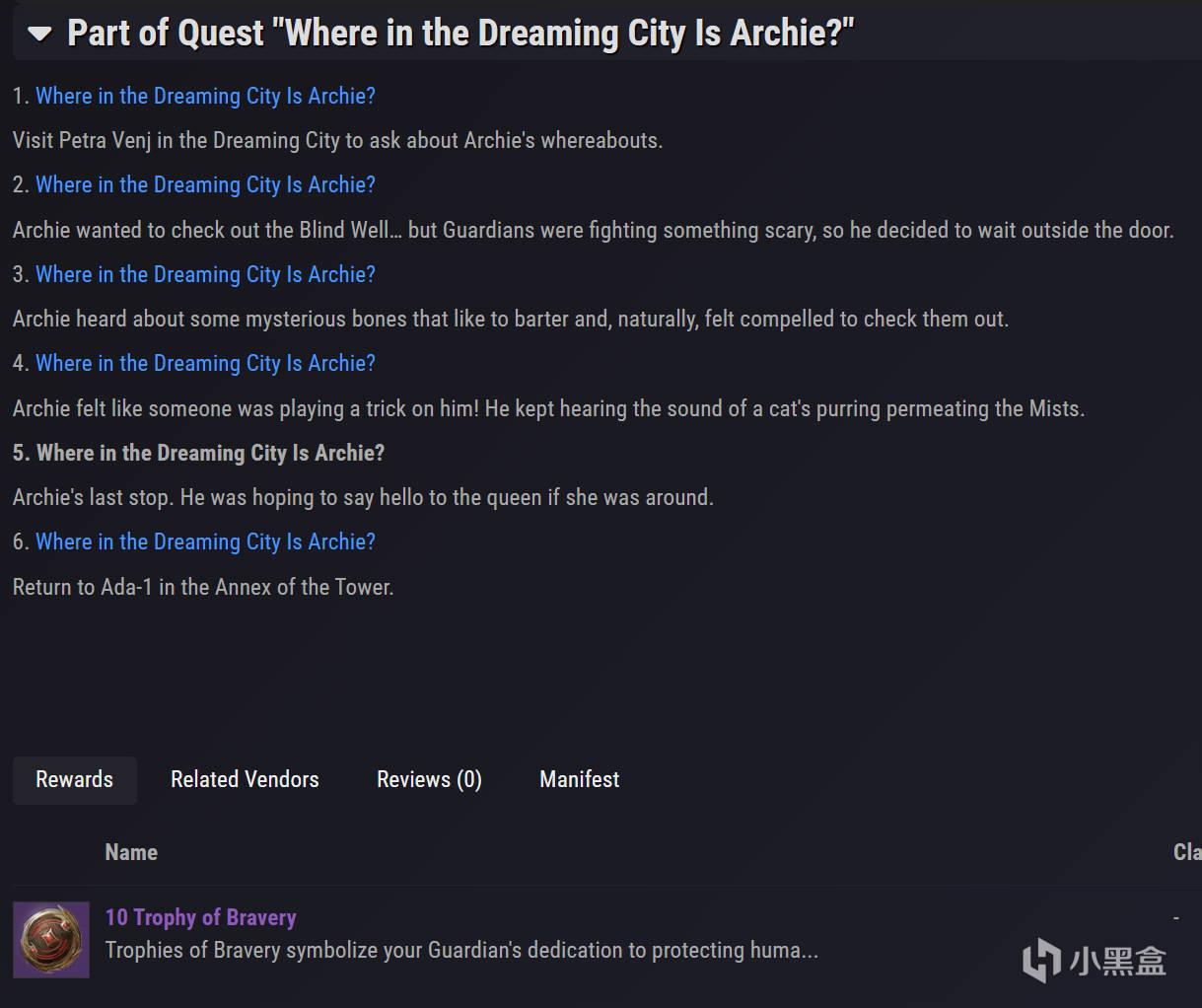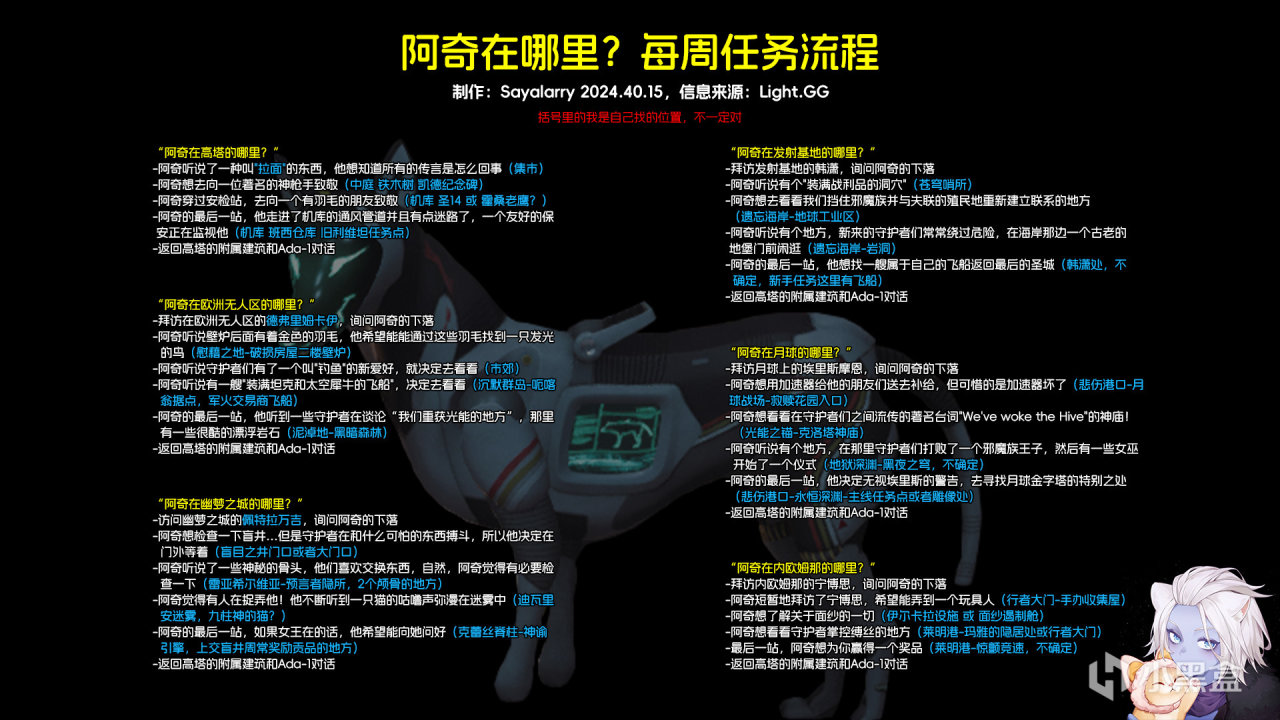 - 任務的流程基本都是:前往一個目的地和主要NPC對話,根據獲得的線索尋找4次阿奇,然後回高塔和艾達對話