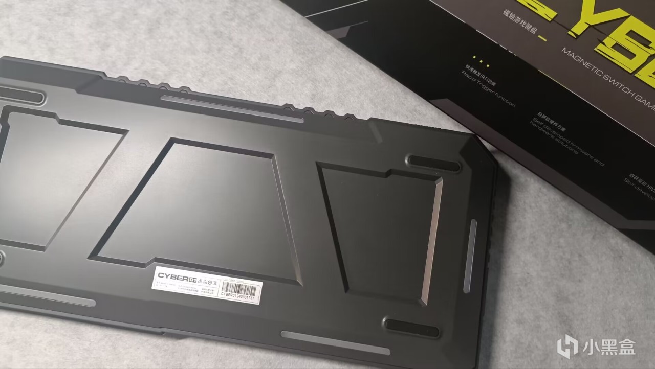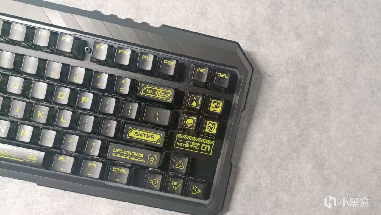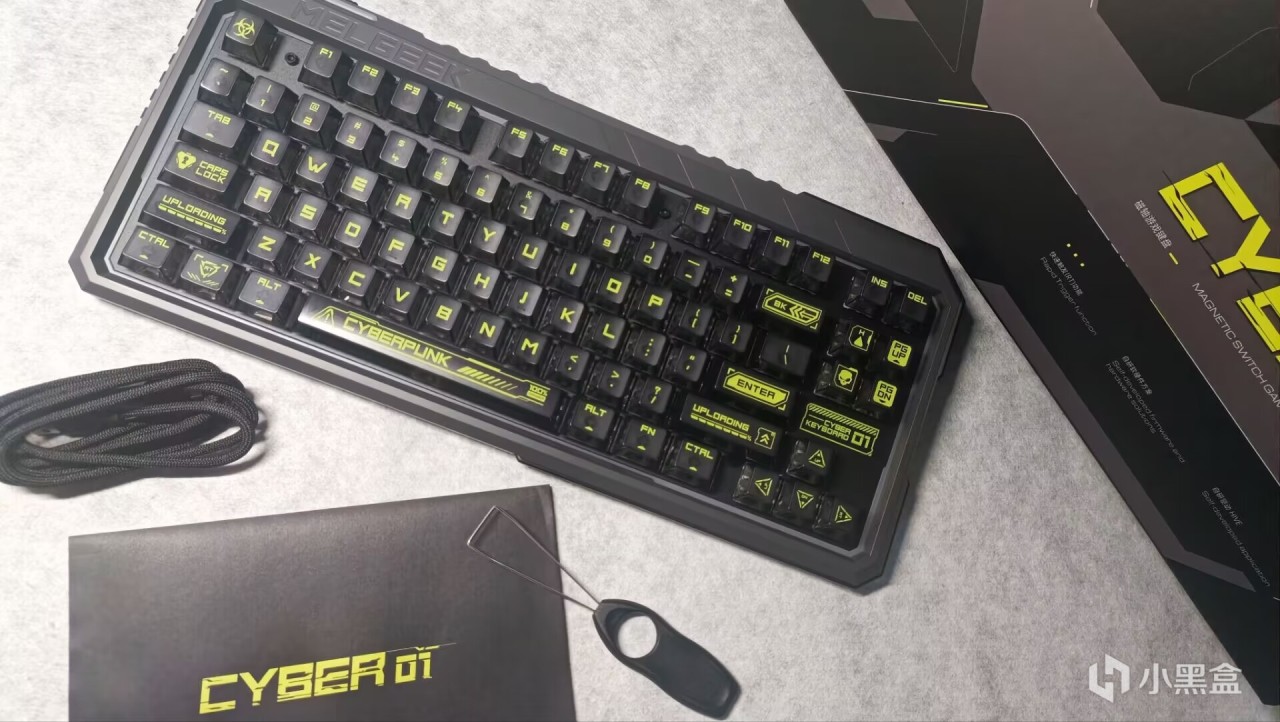 首先来看看外包装,不得不说赛博01这把键盘的外包装做得非常贴合命名,整个箱体采用了黑灰黄的颜色,在表面用了很多线条进行装饰,右中侧则是用花屏效果做出来的“赛博01”几个字,外包装做得非常好看。