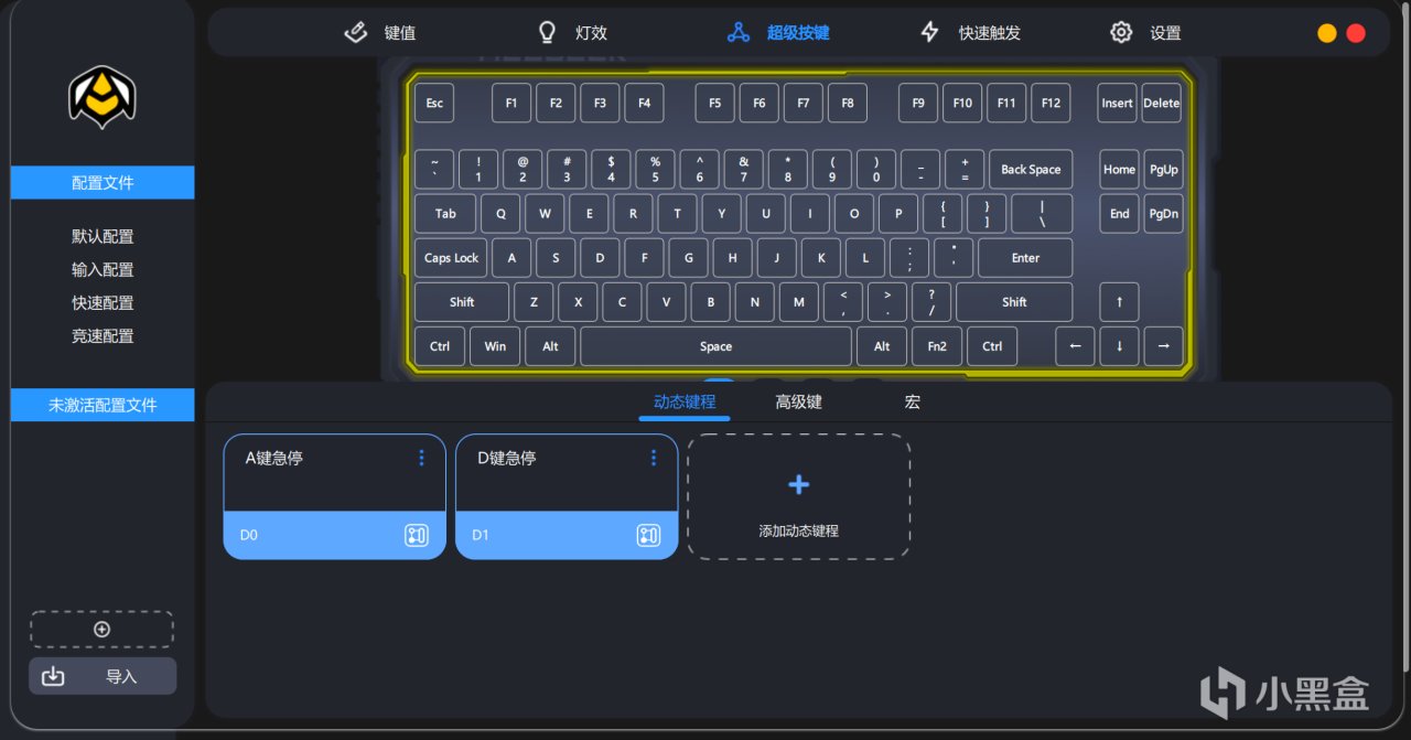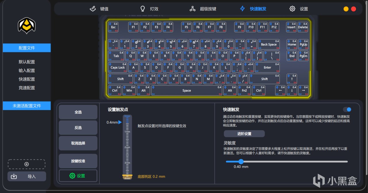 在实际体验上吧,赛博01的驱动实际上就我个人体验的几把磁轴的驱动来说可以说做得非常不错,触发点和复位点的设置、灯效设置与键值等各方面都做得非常全面,而死区方面也能调到0死区,不过避免断触的情况把几颗重要的按键更换为磁玉轴即可。