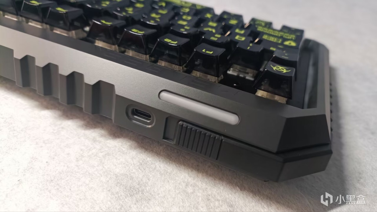 键盘四周也做了部分RGB灯带设计,Type-C接口位于左侧顶部。