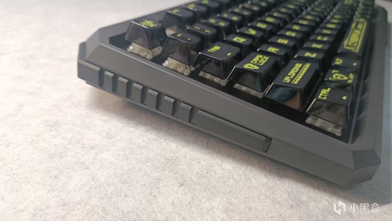 无常规的脚撑设计,虽然铝坨坨上常见无脚撑,但这一点许多厂商也开始在塑料键盘上去掉了脚撑,而赛博01依然无脚撑,不过进行了一个斜向上设计,在打字时也不会对手腕造成较大压力。