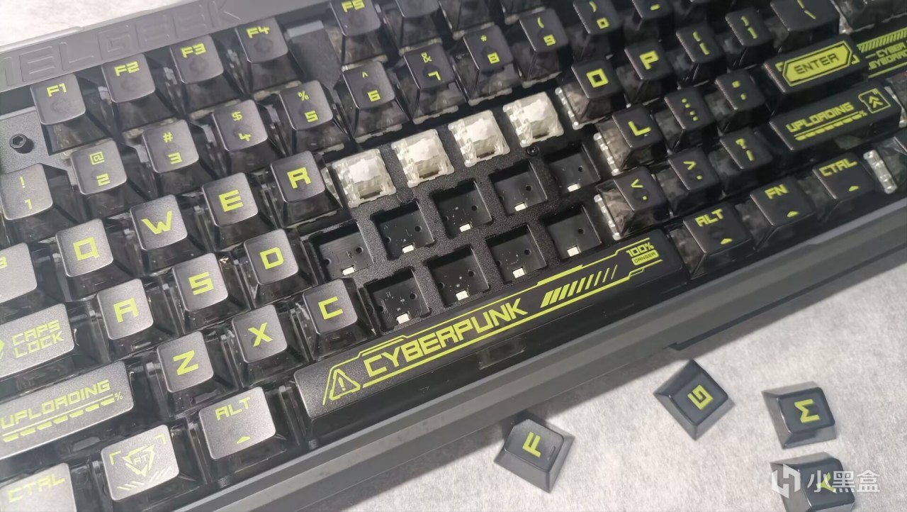 键帽在字符上面做了许多个性化设计,原厂高度,图案、全透搭配多变光效赛博风十足,颜值非常高,键帽采用了PC材质,触感相比PBT材质键帽便失去了一些细腻,更加光滑,不过为了搭配华丽的灯效和赛博风格,PC材质的全透确实也是合适的选择。