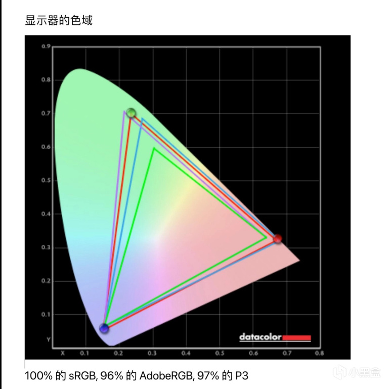 通過紅蜘蛛檢測:100%sRGB、94%AdobeRGB、97%DCI-P3,100%sRGB基本就夠用了。對我來說用來打遊戲的話,這是完全夠用的。