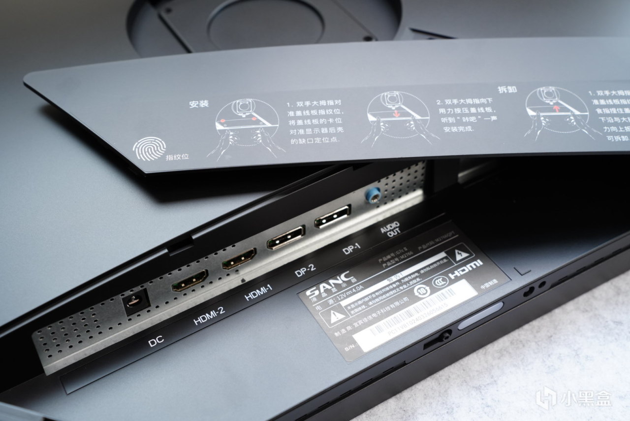 顯示器後面有。顯示器後方爲了顯示器整體的一致性以及美觀考慮,所以在顯示器的連接位置做了一塊擋板,同時擋板兩側同時擋板是可拆,同時擋板做了一個可拆卸的設計。按照圖一中將手指放在兩個圖紙紋處,簡單按壓即可拆除擋板。然後將對應的連接線鏈接進去(慢慢的插進去)