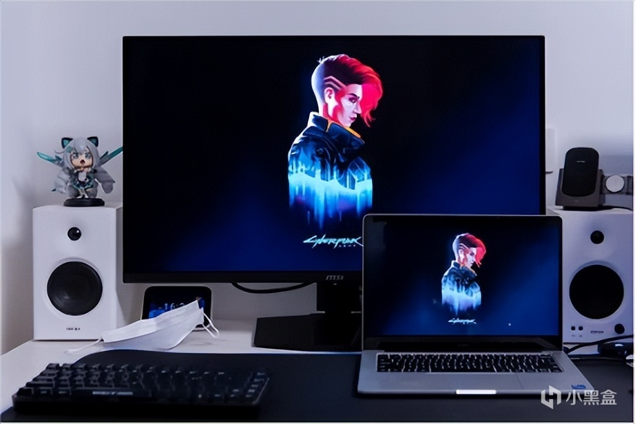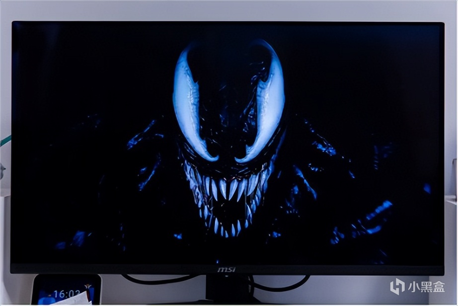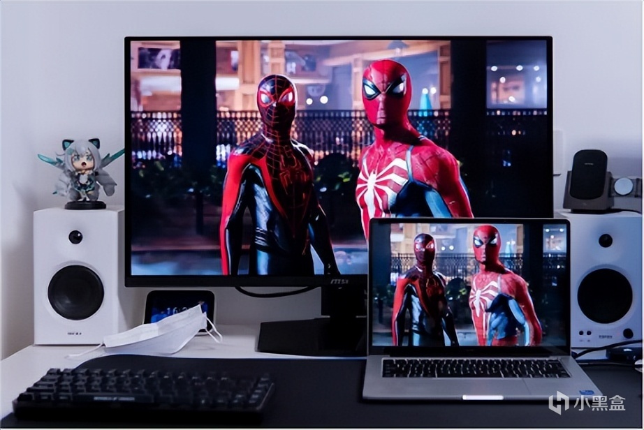 这里简单对比下我这台同样使用镜面屏的笔记本, 99%DCI-P3色域QD-OLED屏和100%sRGB的IPS屏可以说是一眼的差距,QD-OLED色彩更好看,画面对比度更高,看起来更通透,注意看图二的蜘蛛侠紧身衣,微星MAG 321UPX QD-OLED把皮衣油腻质感表现的淋漓尽致,笔记本屏幕则相对干瘪,另外微星MAG 321UPX QD-OLED中蜘蛛侠背景色彩浓郁,人物与背景分离度更高。