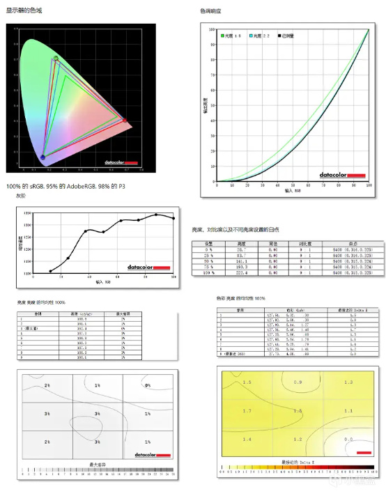 默认模式下,使用红蜘蛛实测,微星MAG 321UPX QD-OLED色域覆盖98%DCI-P3,色调响应和标准光度2.2基本吻合,灰阶绝对温度在6100K-6350K之间,稍稍偏暖,SDR最高亮度在222nit左右,白点温度6400K,色彩均一性方面,ΔE最大1.2,亮度均一性方面,最大偏差3%,色彩精准度上,平均ΔE为0.84,总体表现相当优秀。关于1000nit峰值亮度,注重HDR游戏的用户建议在OSD菜单中自行解锁。