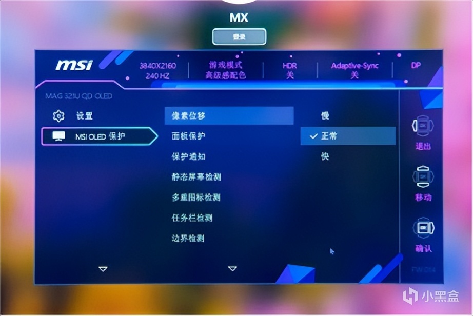 微星MAG 321UPX QD-OLED采用了三星QD-OLED屏幕,镜面材质,4K分辨率的情况下还多预留了一些像素出来,长时间显示画面时,像素平移可以避免烧屏现象。