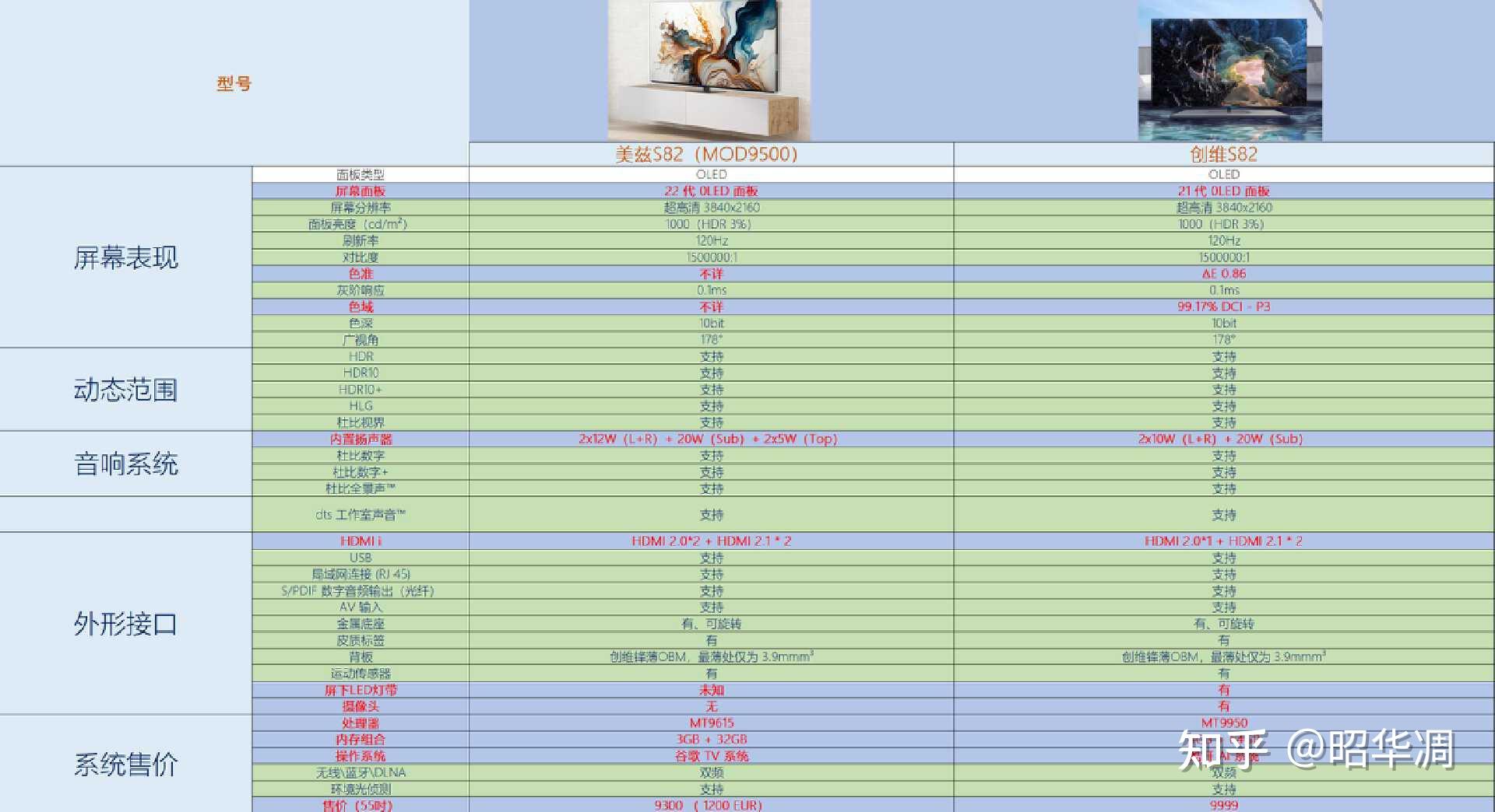 - 首先是面板, metz MOD9500 搭载最新的LG OLED V22 面板,800 万个可单独控制的自发光像素,峰值亮度 1000nits,可以实现接近 0 尼特绝对黑色的值。这比创维 S82 的 LG OLED V21面板更强。不过奇怪的是,我在创维海外官网看到的 S82 又是 V22 面板了,不知道是不是国内发售是老版的原因。。