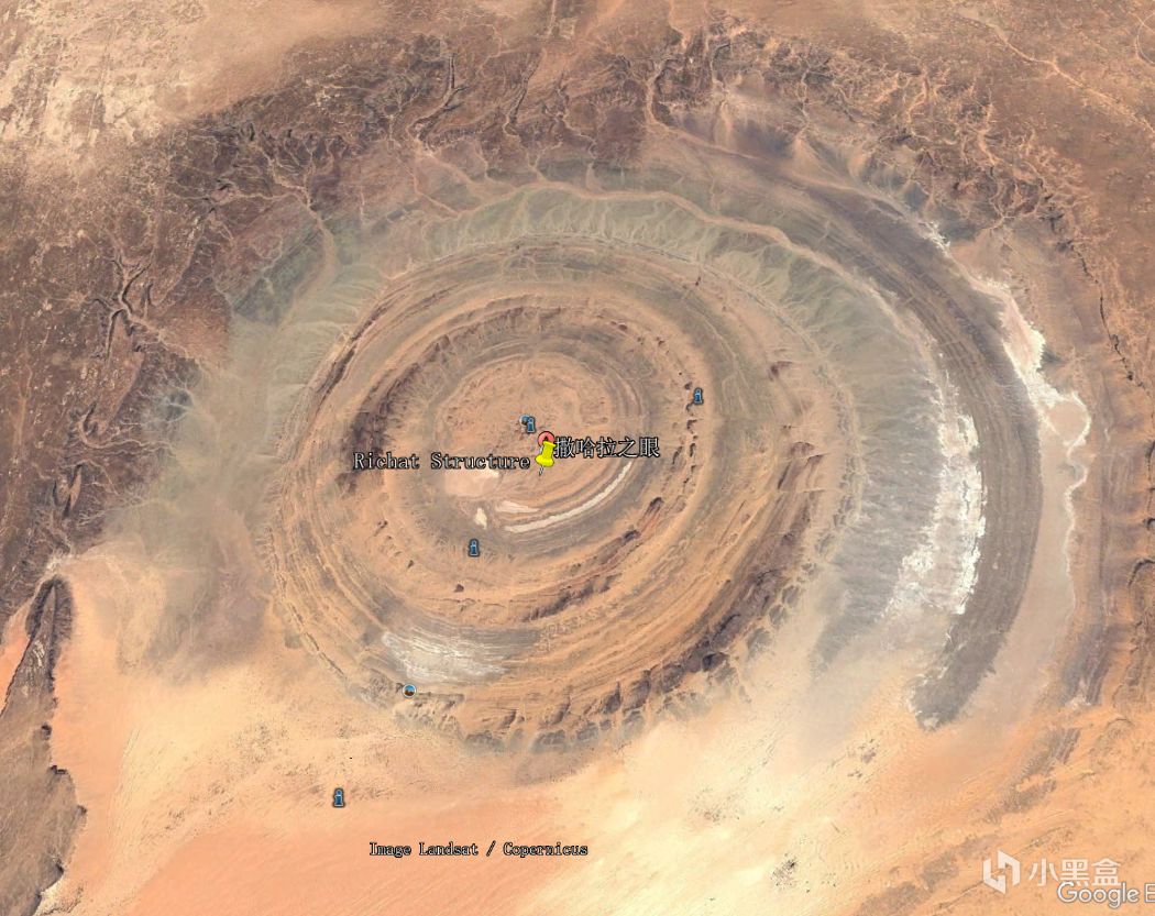 理查特结构Richat Structure位于撒哈拉沙漠西部的巨大同心圆地形,直径有50公里高度约400公尺,从太空看起来就像是颗眼睛,虽然一开始被认为是个陨石坑,但后来经过研究后发现应该是地形抬升侵蚀的结果。