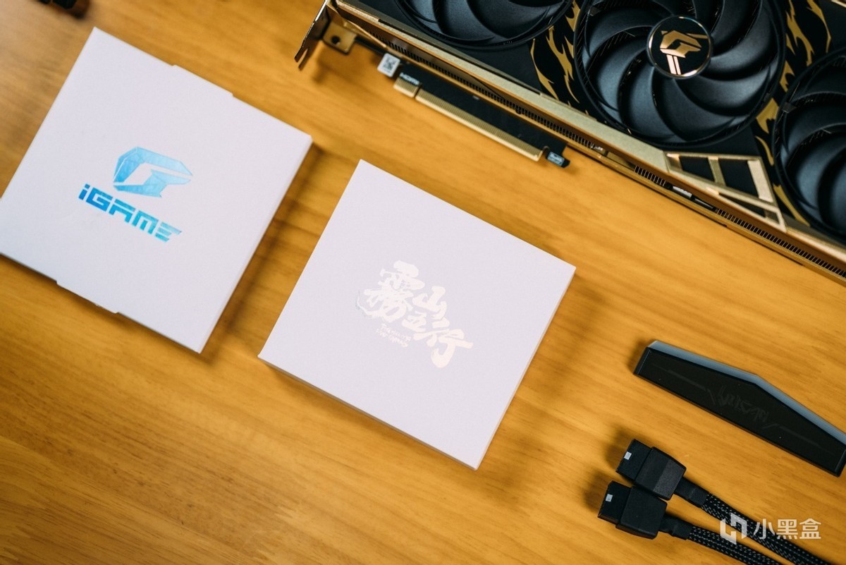 礼盒式的包装设计呈现出了更强的开箱仪式感,比如在拿开顶层的配件包之后,就会看到iGame GeForce RTX 4070 Ti SUPER雾山五行定制版OC 16GB内嵌在礼盒中,下方的盒子则是用来收纳800x400x3mm加长尺寸的iGame x 雾山五行鼠标垫。同时,显卡背后的空间还内嵌了显卡相关的说明书,以及喜闻乐见的五行面具徽章。
