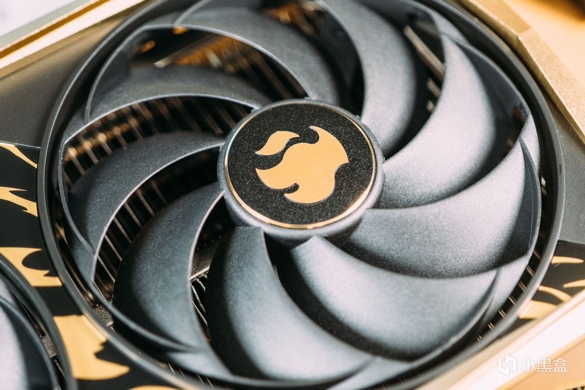 提供显卡主动散热性能的是3个100mm口径风扇,使空气形成漩涡聚风吸入提升风压,增加进风量。同时“聚风镰环”扇叶本身也颇为巧妙,9翼扇叶通过环环相连加固,每一片扇叶都进行了增厚与边缘锋利设计,在提升性能的同时,也避免高速旋转造成过量的噪音。而在实体体感中,iGame GeForce RTX 4070 Ti SUPER雾山五行定制版OC 16GB的风噪沉稳,不会对游戏、工作造成任何影响。