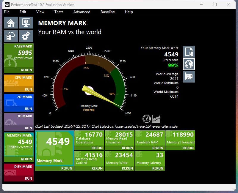 在PerformanceTest中,它的得分为4318,进入了全球1%的序列之中。也就是说,即便我们不乱折腾超频,只是开启XMP,它就已经很强了。