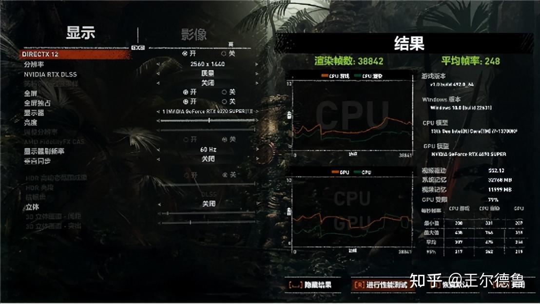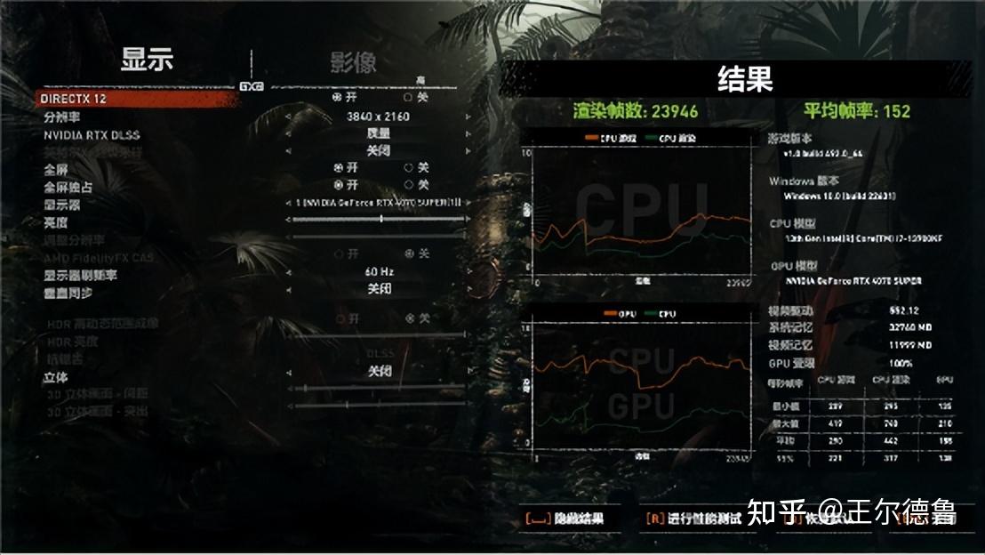相比上面两款游戏,《古墓丽影:暗影》对硬件的性能没有那么高的要求,4K高画质也能流畅运行。使用游戏自带的benchmark测试,2K分辨率、高画质、开启DLSS,平均帧率248,渲染帧数38842;4K分辨率、高画质、开启DLSS,平均帧率152,渲染帧数23946。