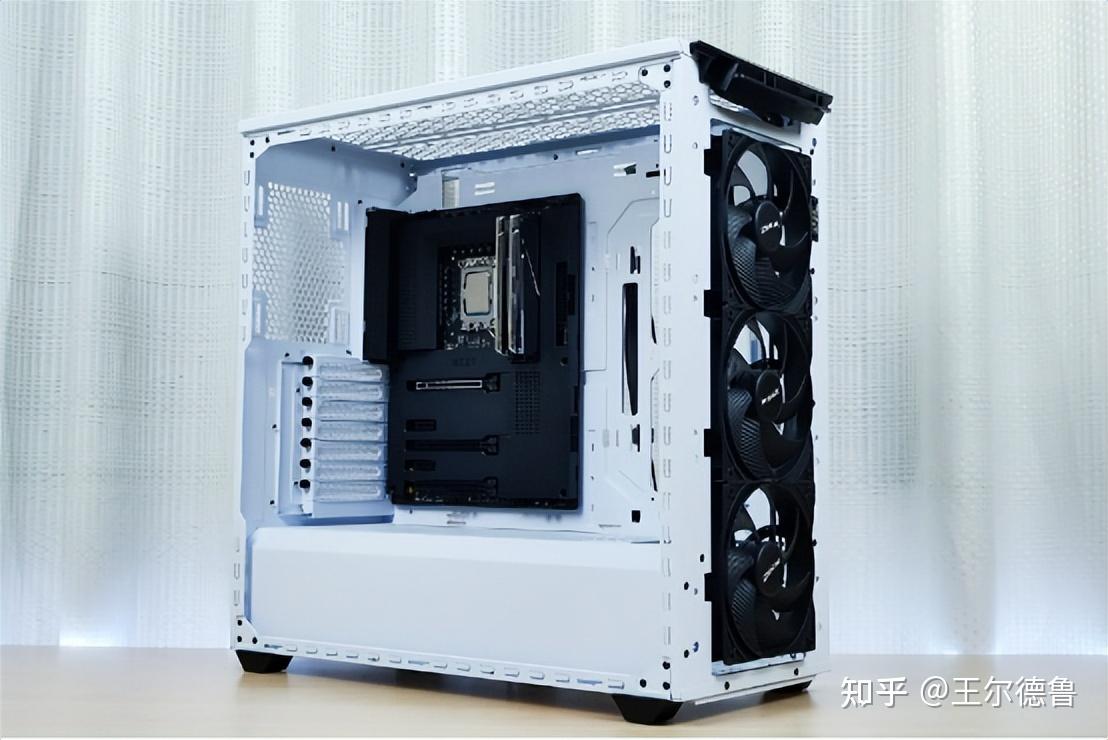 为了方便后续的升级,我特意选了台“体型庞大”的全塔机箱,尺寸550*247*522mm,支持安装420水冷,内部空间非常富余。这台机想是我喜欢的黑白撞色设计,自带3把黑色140mm大尺寸PWM风扇,刚好和我的黑色主板搭配装机,思来想去,我觉得用“帅气”来形容它的观感最合适不过了。