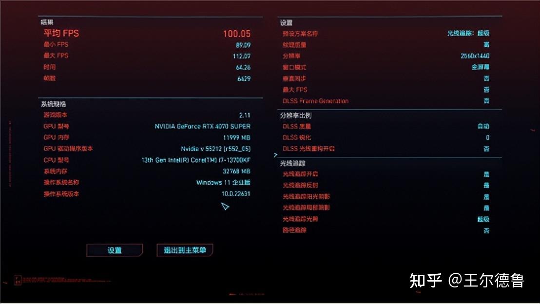 《赛博朋克2077》绚丽的场景风格比较吃显卡配置,在i7-13700KF的加持下,索泰RTX 4070Super发挥了其应有的性能。2K分辨率,开启超级光追+DLSS,平均帧数100 FPS,最大帧数112 FPS,游戏内没有出现卡顿、画面撕裂等问题。