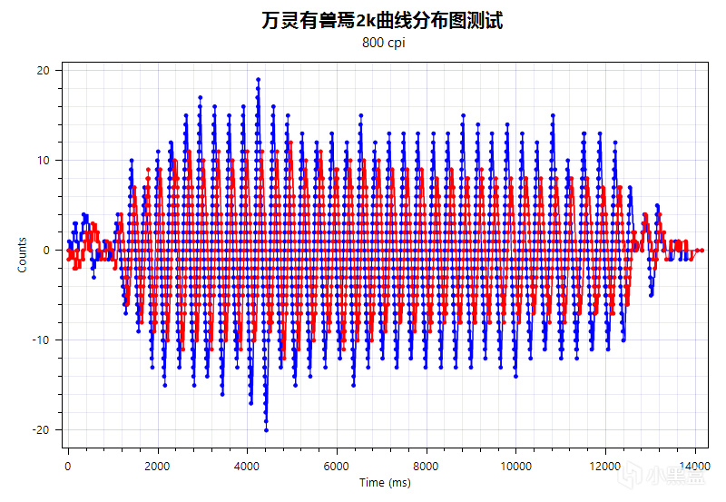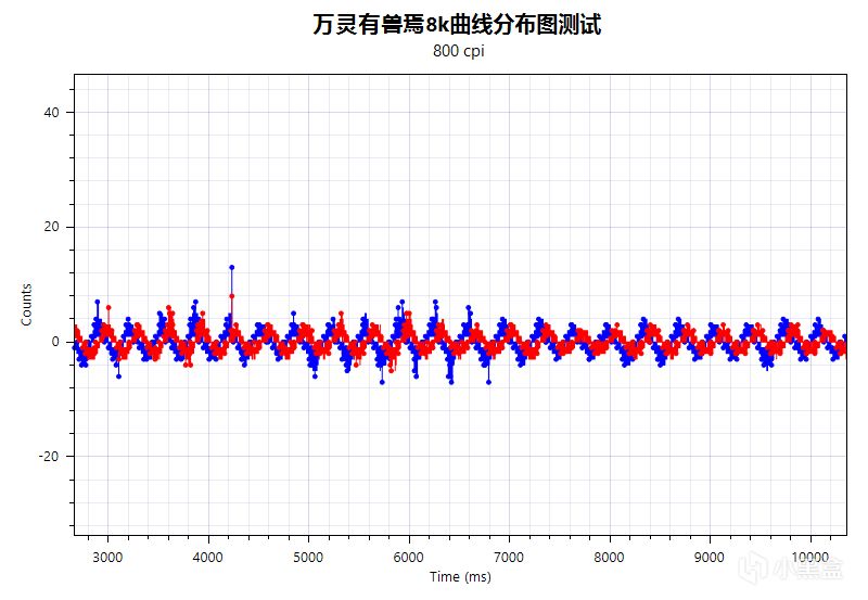 在來看一下鼠標的曲線分佈圖,我這裏簡單的測了一下,鼠標分別在1k,2k,4k以及8k的曲線分佈,可以看見曲線分散的很均勻,調教的很好很好。
