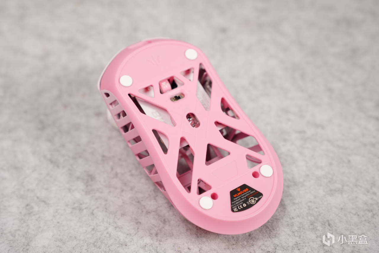 鼠標整體做了很大的鏤空設計,極大的節省了鼠標的重量,當然別擔心,鼠標也是做了防潮處理的,只要你不是直接把鼠標泡在水裏,基本上是沒啥問題的。鼠標底部原廠帶了小圓點的腳貼,說實話足夠了,底部只有一個開關,沒有dpi調節按鍵,如果想調節dpi那隻能去驅動裏面調整,或者設計其他的快捷鍵。