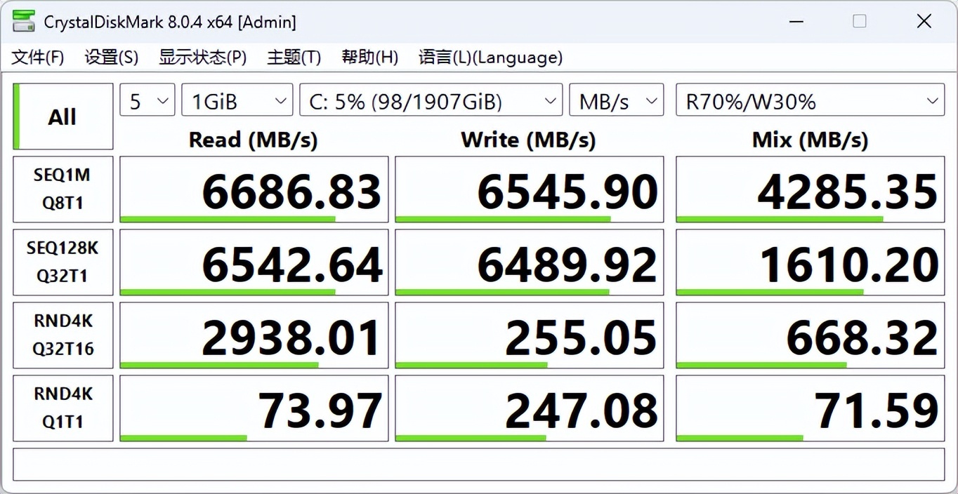 揭开调制可以看到,采用 Phison PS5027-E27T、PCIe 4.0 主控,支持第 4 代 LDPC & RAID ECC 纠错能力,以及 TRIM 指令和 S.M.A.R.T 自我检测分析报告技术。提供了最大顺序读取速度为7000MB/s,最大顺序写入速度为6400MB/s,最大随机读取和最,大随机写入均为1000K IOPS