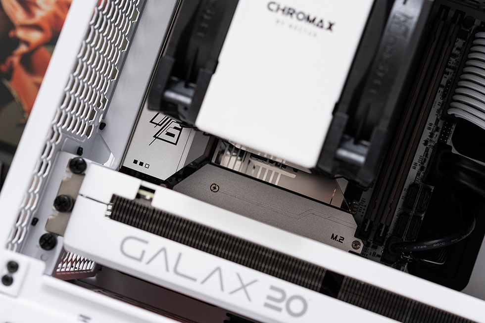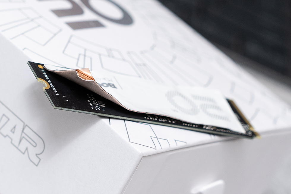 正面的白色定制散热片采用了专属高效复合材料,SSD快速散热,保持高效运行。