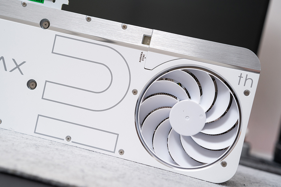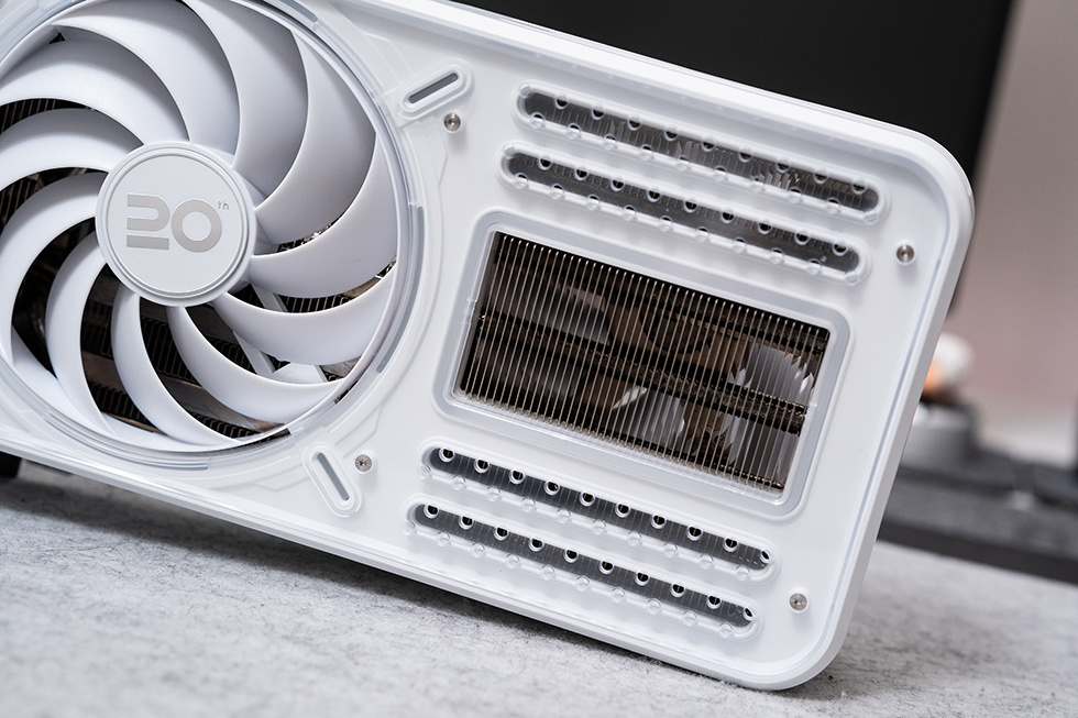 显卡的的背板和导风罩均为铝合金材质,最为明显的就是20周年的文字涂装,其中数字20的“0”刚好用风扇代替,加上边缘区块的拉斯、抛光工艺,整体的质感非常不错。