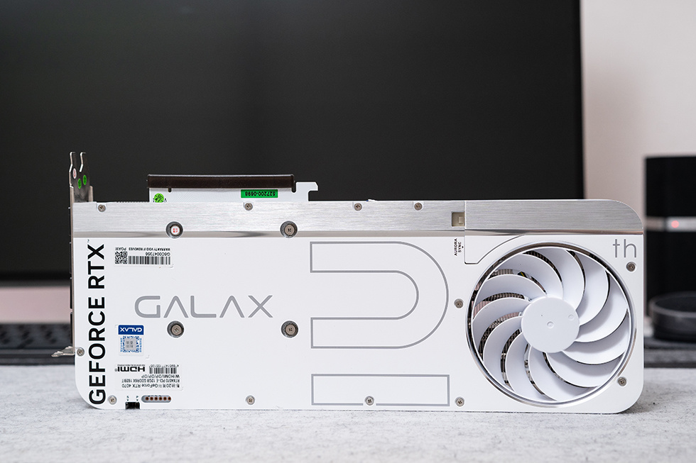 影驰20周年RTX 4070纪念版显卡在外观上极具辨识度,背板的20字样涂装也极具个性,正面双风扇加背面单风扇的设计让整体散热性能在双槽厚度下进一步提升。