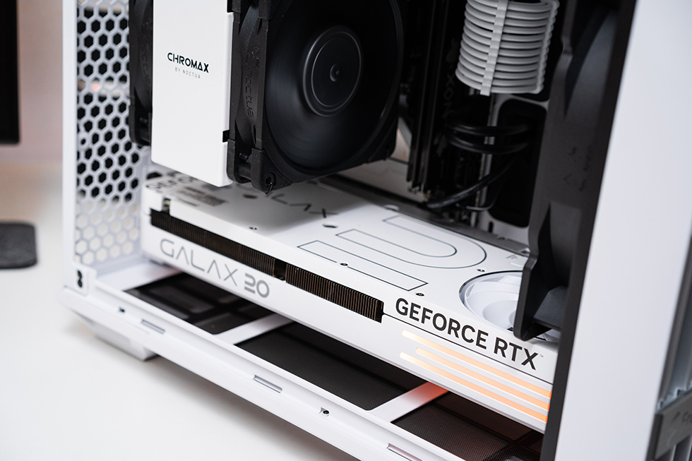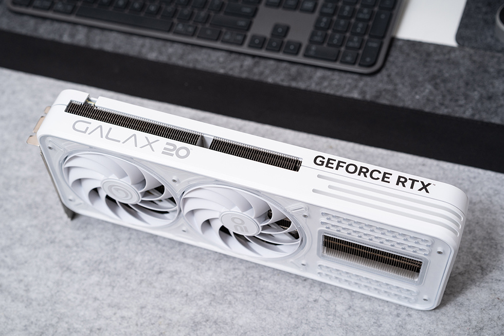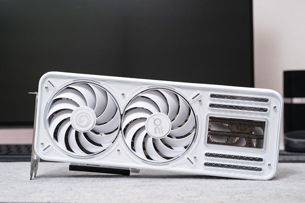影驰20周年RTX 4070纪念版整体为纯白涂装,采用了类似公版显卡的散热结构,正面双风扇加背面单风扇的设计,正面的两把风扇100mm,背后那把是90mm,扇叶均是11片,风扇的周新位置均添加了影驰和20周年纪念标志。