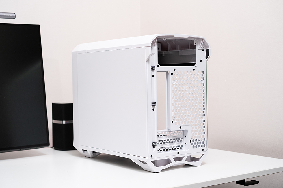 Torrent Nano 的正面全面继承了Torrent 家族的设计元素,开放式格栅设计与180 mm前置风扇(可更换为两把14cm或12cm的风扇),获得最大的进气量,机箱背部几乎遍布散热开孔,确保了风道顺畅。