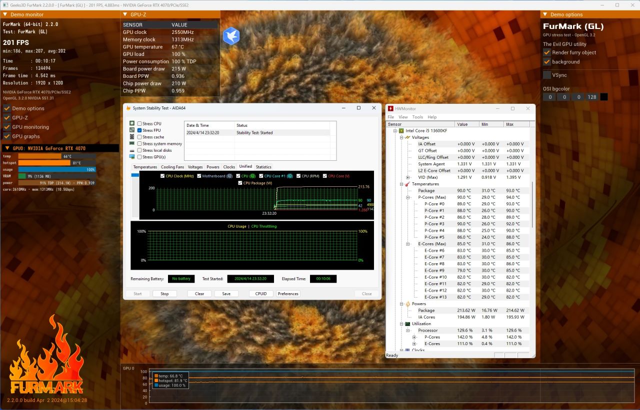 首先看一下双烤的温度,CPU功耗215W,最高温度93℃,显卡温度67℃。