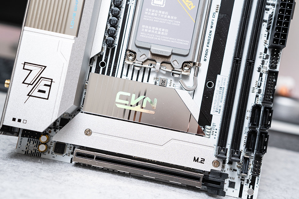 七彩虹的CVN B760I FROZEN WIFI D5 V20采用了纯白色 PCB 设计,搭配银白色的散热装甲,南桥提供了独立散热装甲,采用镜面工艺,上面有银色镭雕散CVN Logo,银白配色极具质感。