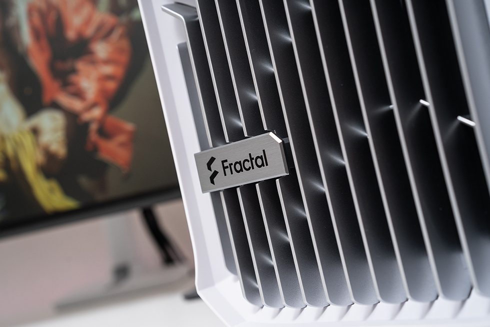 Fractal的LOGO铭牌嵌在在前面板下方的格栅中,虽然是塑料材质,但是类金属的表面处理看上去还是很有质感的。