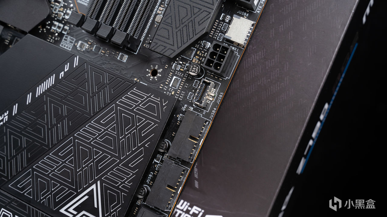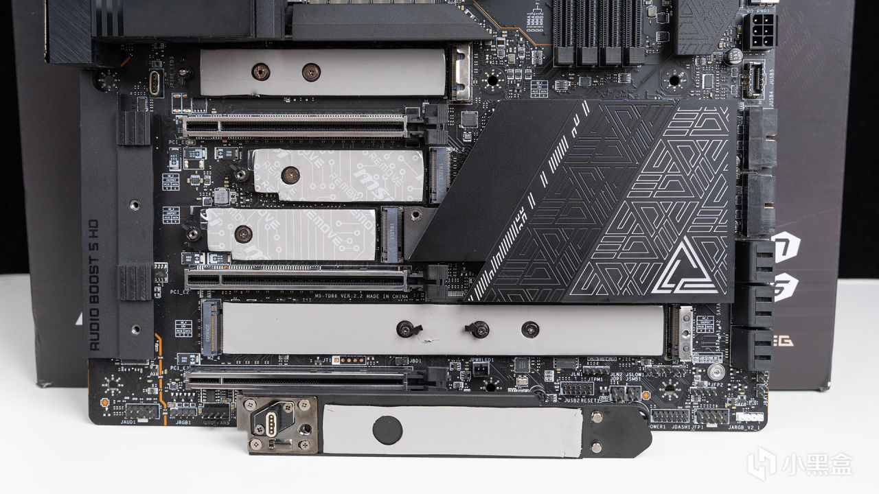 在五组M.2插槽中,从上往下数,第三组是支持PCIe 5.0X4,其余四组均支持PCIe 4.0X4,靠下方的两组还预装了便捷卡扣。第一组散热马甲具有独特的触点&卡扣,不仅拆装更方便,而且马甲上RGB灯效也不需要通过任何线材供电。