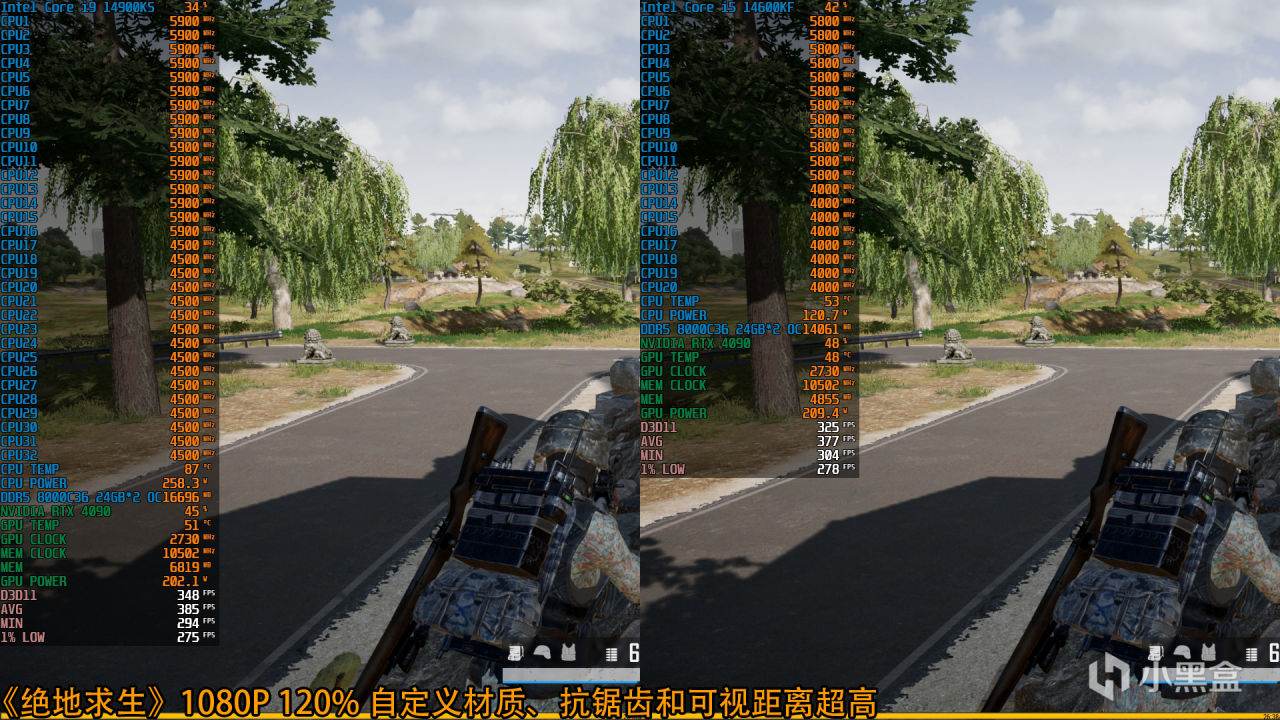 《绝地求生》对CPU核心优化就没那么好了,总得来说酷睿i9-14900KS在平均帧数更高一些,而酷睿i5-14600KF反而在1% LOW帧更高一些,它和《Apex英雄一样》,选择甜点级CPU超频会更合适,没必要追求Core i9了。