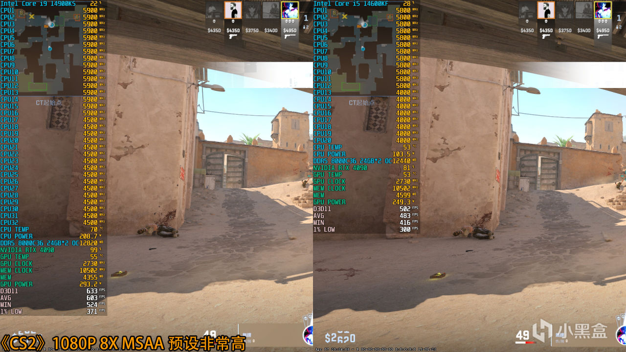 《CS2》相比上一代更能利用显卡和CPU性能,在4K分辨率,酷睿i9-14900KS在1% LOW帧略微有3.5%的优势,2K分辨率开始体现在1% LOW帧拉开差距,酷睿i9-14900KS可直接领先23%,1080P分辨率无论是平均帧还是1% LOW帧都能领先20%以上。