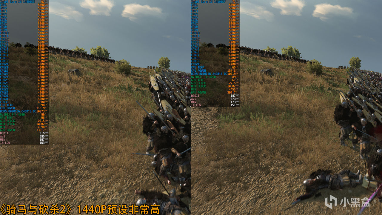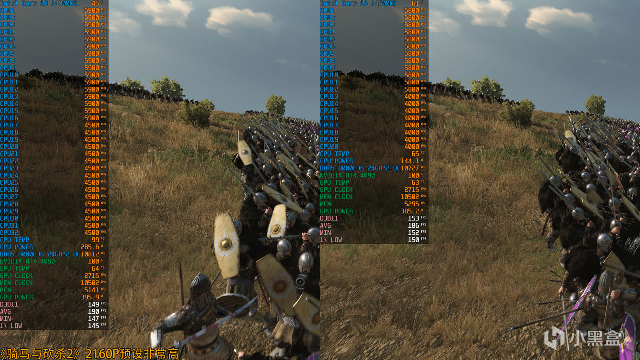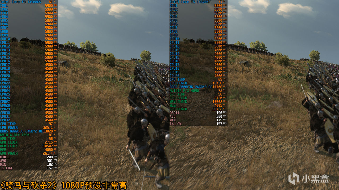 另外从OSD硬件监测中可以发现,酷睿i9-14900KS虽然整体性能更强,但是代价也是用极高的运行功耗换来的,玩游戏CPU分分钟也会达到200W功耗,在《骑马与砍杀2》中甚至会突破300W,因为核心电压会达到1.6V,还要确保不要碰到100℃温度墙(避免降频带来性能下滑),而酷睿i5-14600KF在超频状态下最多最多也就150W,相当于酷睿i9-14900KS的一半功耗而已,温度也凉快。