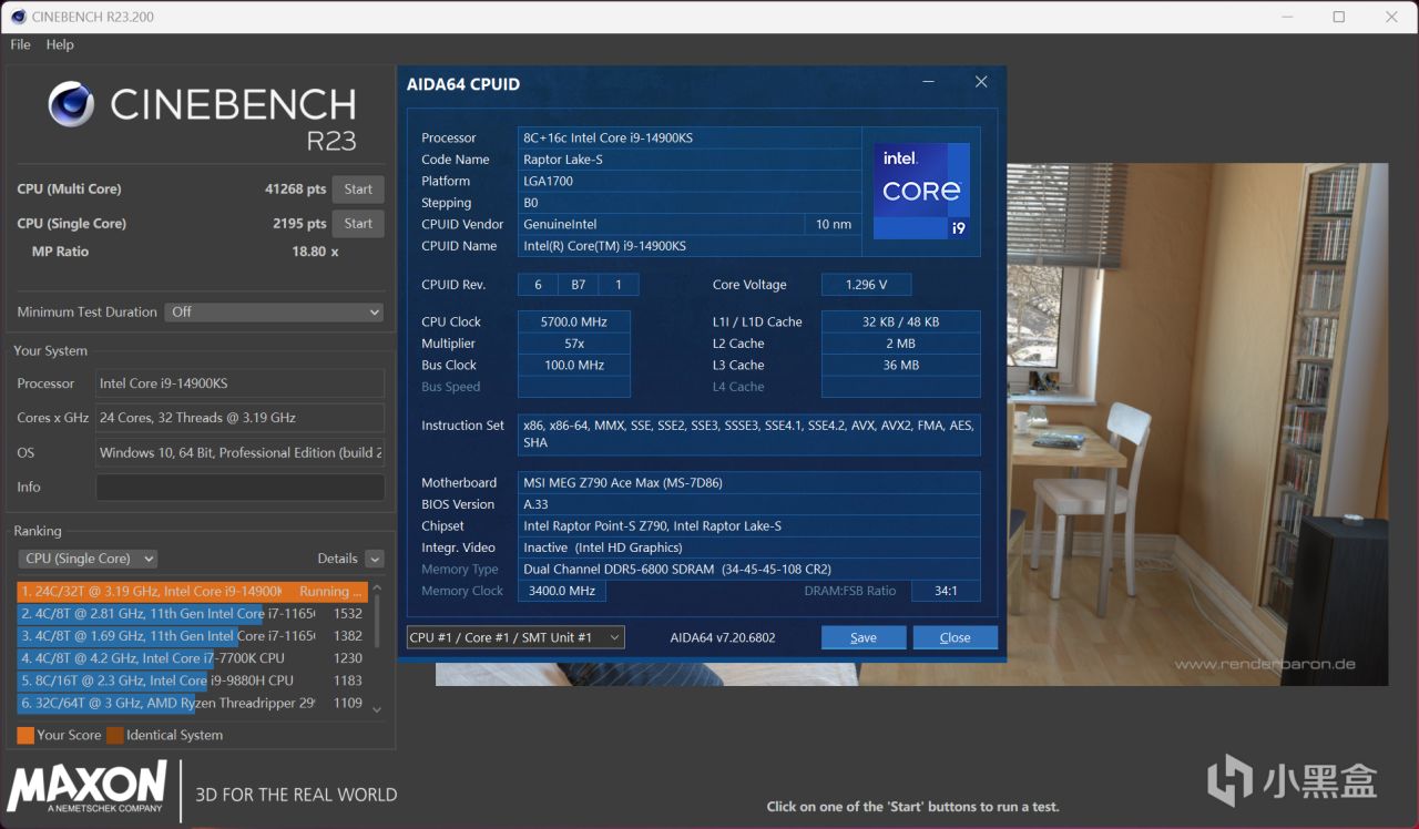 酷睿i9-14900KS手动定频5.7GHz大核+4.4GHz小核,CINEBENCH R23多核分数为41268 pts,单核分数为2195 pts,多核方面其实就是看作为不撞温度墙的14900K跑出来的成绩,而单核由于最大睿频定在5.7GHz会有下滑,实际对生产力其实没多大影响,因为涉及多核性能更多的。