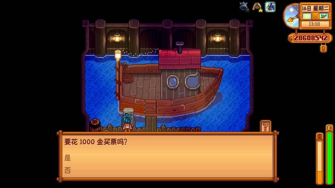 我們進去後,就會看到一艘破爛的船,威利就會讓我們給他找材料修船,修船所需的材料爲200硬木,5個電池組,5個銥錠,當我們交付後,當天夜裏的晚上就會觸發威利與羅賓修船劇情(睡覺觸發),第二天再讀威利的信,就可以得知船修好了,而且威利商店變成了早上8點開門,這時我們就能出發前往姜島了,往返一次需要1000元