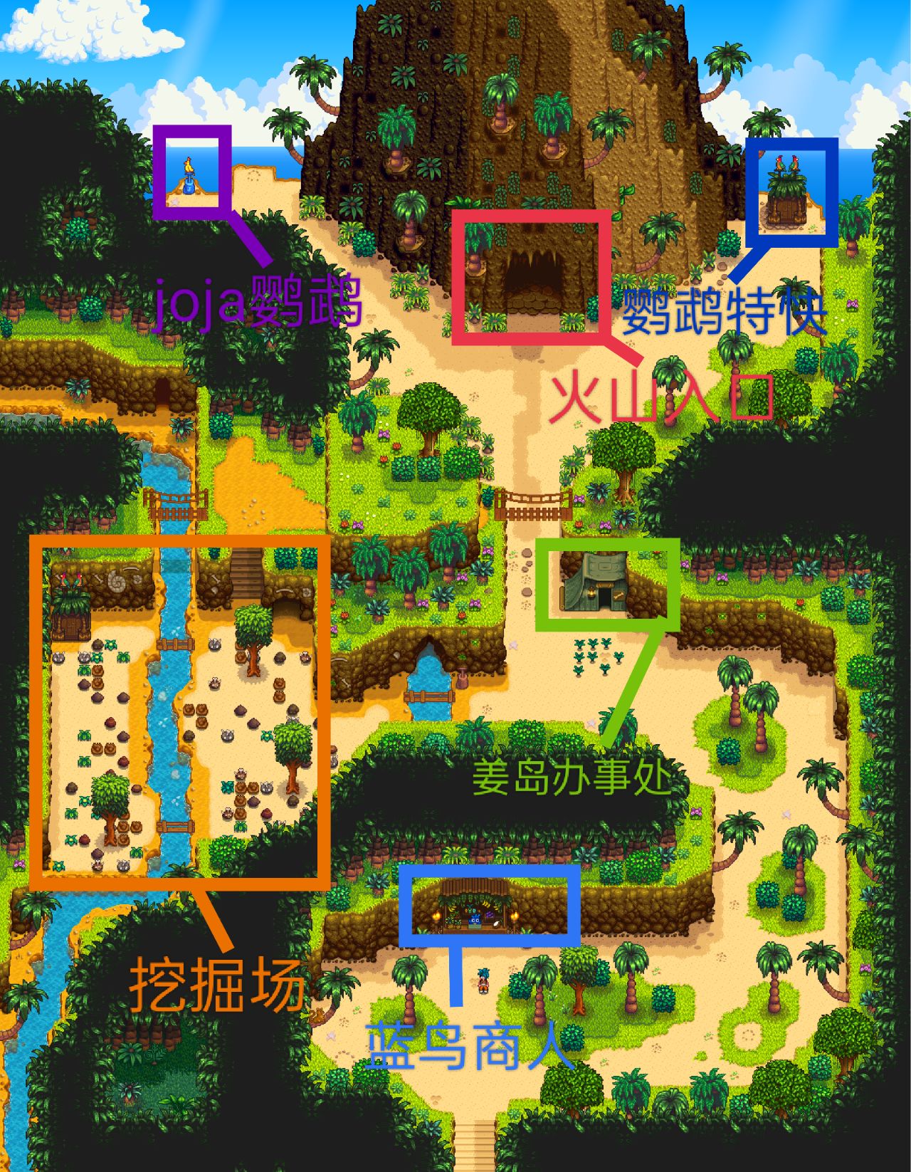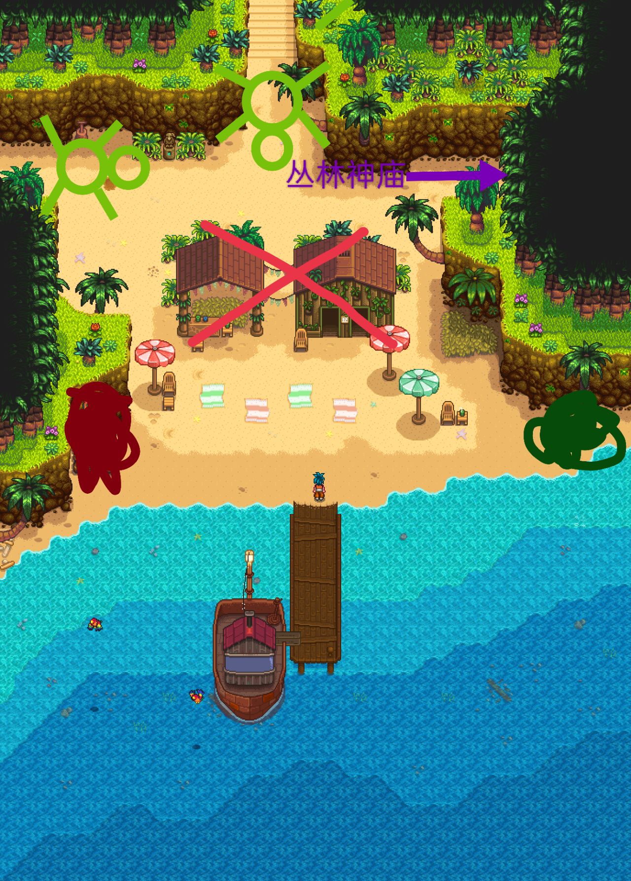 無論我們是坐船來,還是傳送來,初始地都會在這裏,當新手第一次來的時候,西部區域與北部區域的入口是會有烏龜擋路的,中間的度假村和鸚鵡特快(紅色塗掉那塊)是一片廢墟,需要金核桃修復,東南部區域的入口是堵住的,只有右邊的叢林神廟入口可以進入,如圖所示