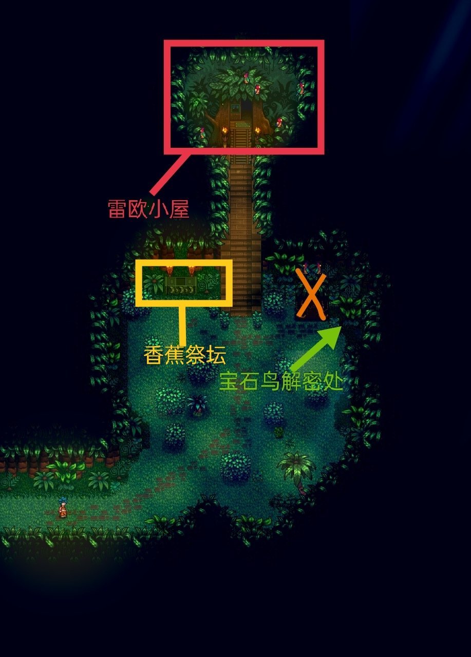 第一次上姜島必須只能先去叢林神廟,到雷歐小屋裏面喂鸚鵡一個金核桃,觸發劇情後,才能展開後續的探索,會開啓姜島建築的維修解鎖,在姜島上所有的維修解鎖費用都需要金核桃,所以金核桃就好比是姜島上的貨幣,香蕉祭壇與寶石鳥解密都是獲取金核桃的設施