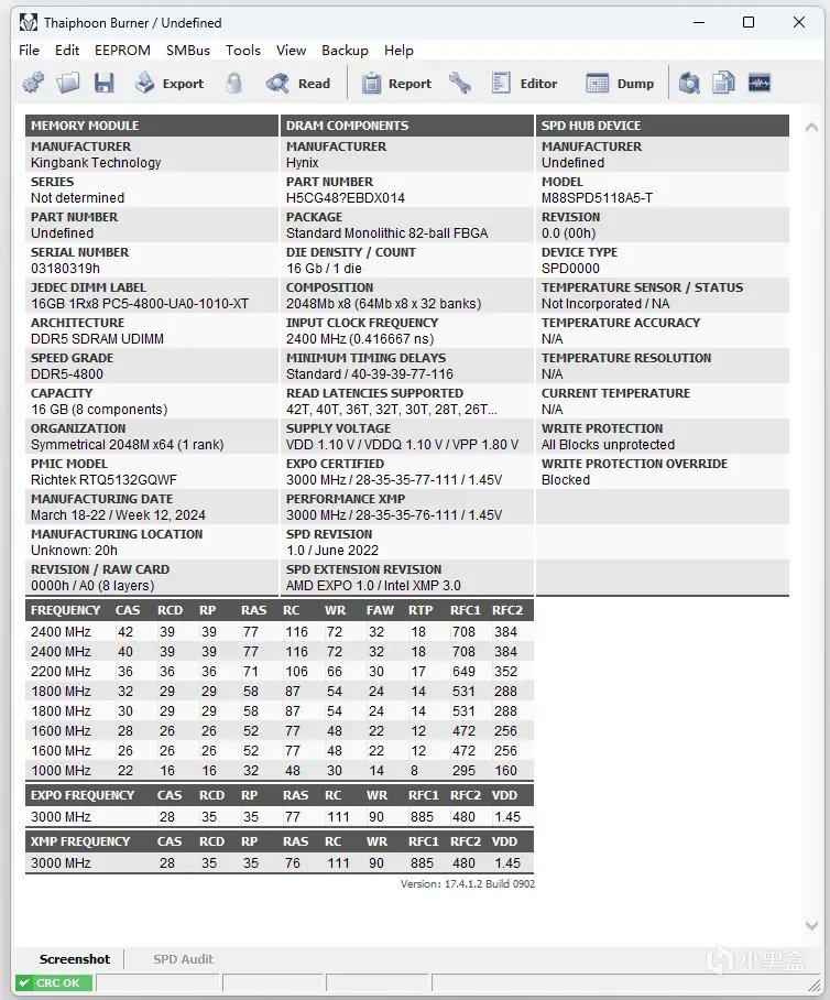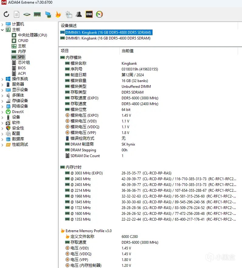 AIDA64正確識別出金百達星刃DDR5內存的全部信息,其製造時間在2024年2月底,DARM的製造商爲海力士,默認頻率爲4800MHz,時序爲42-39-39-77;開啓XMP後頻率爲6000MHz,時序爲28-35-35-77。