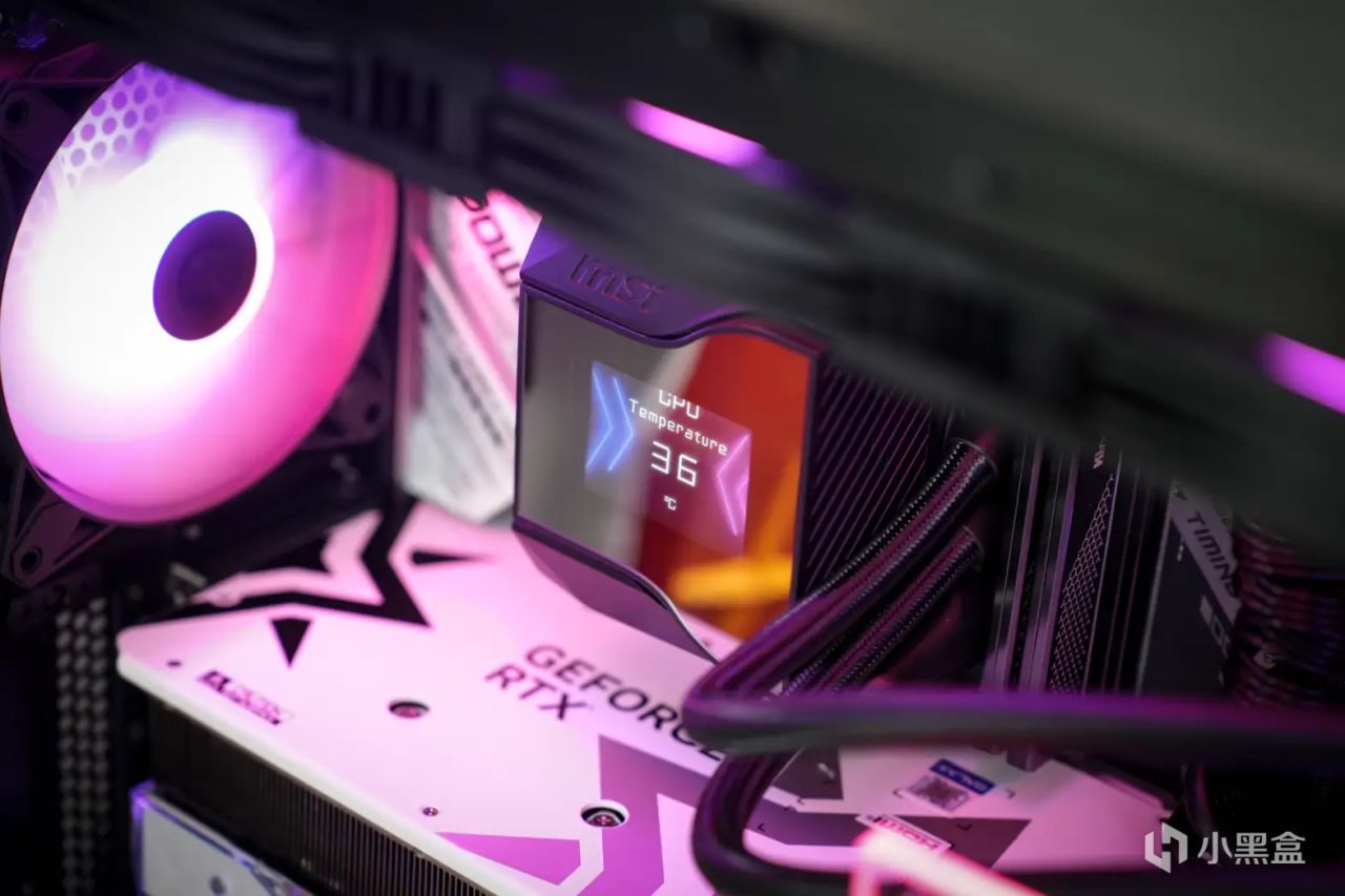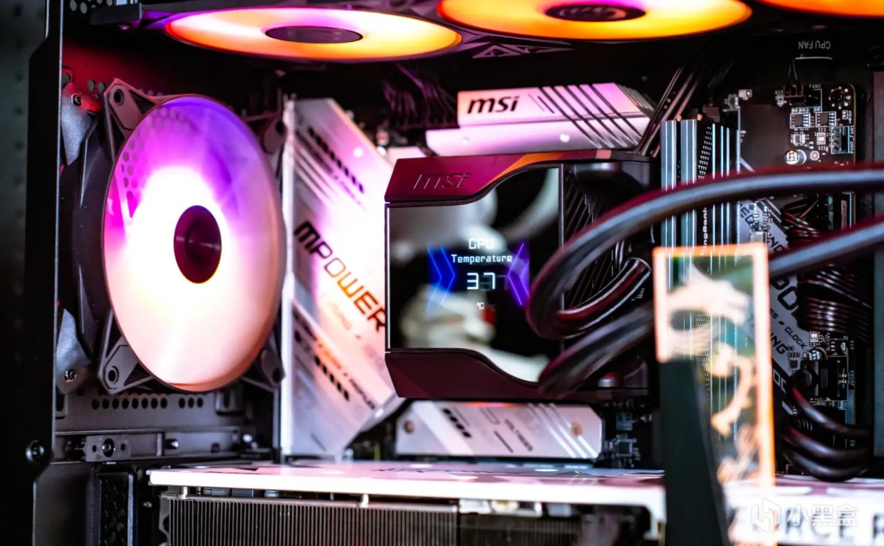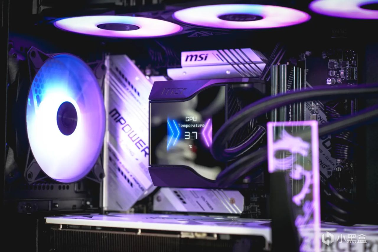 散熱器則是微星MPG CORELIQUID D360水冷散熱器,該散熱器最大的亮點就是在水冷頭上,內部搭載了一個60mm的下壓風扇,強化VRM模組散熱;而在上方還有一塊2.4 英寸IPS面板屏幕,不但可以顯示本機CPU 溫度、水泵風扇轉速等一系列信息,還可以通過MSI CENTER軟件自定義圖片、視頻等內容,玩法自由個性。